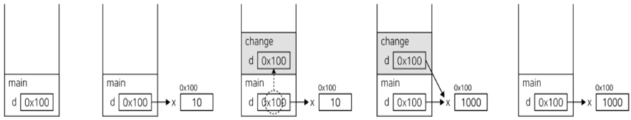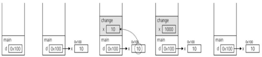 -> change메서드에서 main메서드로 넘겨받은 d.x의 값은 1000으로 변경됐지만 main메서드의 d.x의 값이 변경된 게 아니라 복사된 change 메서드의 매개변수 x의 값이 변경된 것