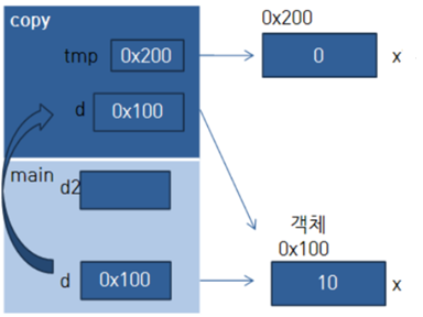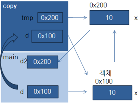 | 7) tmp.x = d.x | d.x의 값(객체의 주소)을 tmp.x 값(객체의 주소값)에 복사한다. (tmp.x -> 0x200(10)) |