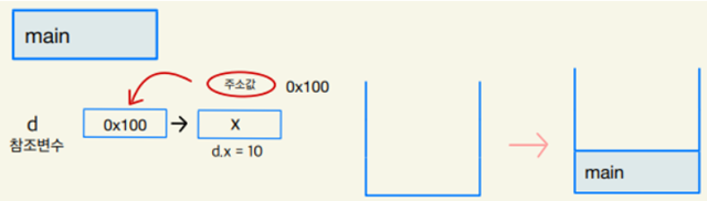 main메서드가 println 메서드 호출한다.d2.x와 d.x는 같은 값을 가리키고 있어서 똑같이 10이 출력! |