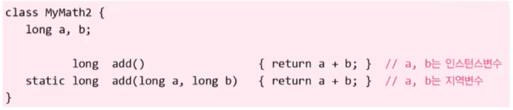 static long add(long a, long b) { // 클래스 메서드(static메서드):iv사용 무, g a와 b는 지역 변수