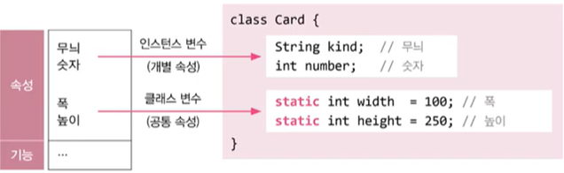 1) 변수의 경우 속성(멤버변수) 중에서 공통 속성에 static을 붙인다. (앞부분에서 나옴, 개별 속성은 iv)