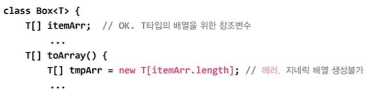 2) 배열 생성할 때 타입 변수 사용불가. 타입 변수로 배열 선언은 가능