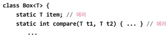 -> 모든 객체에 대해 동일하게 동작해야하는 static 멤버에 타입 변수 T를 사용할 수 없다. T는 인스턴스변수로 간주되기 때문.(static멤버는 인스턴스변수를 참조할 수 없음)