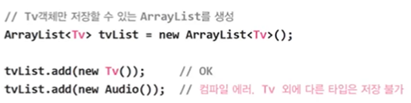 // tvlist.add(new Audio()); // 에러 Tv, 또는 그 자손만 ok