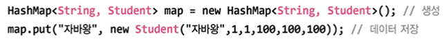 map.put("자바왕", new Student("자바왕", 1, 1, 80, 100, 100));