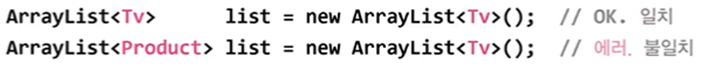 // ArrayList<Product> tvlist = new ArrayList<Tv>(); // 에러 타입 불일치