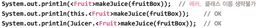 System.out.println(Juicer.<Fruit>makeJuice(fruitBox)); // makeJuice( ) 호출