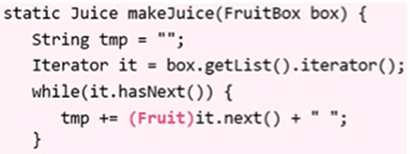 | Static < T extends Fruit > Juice makeJuice(FruitBox<T> box) { | static Juice makeJuice(FruitBox<? extends Fruit> box) { |
