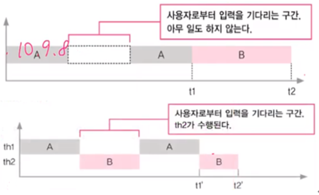-> 만일 사용자로부터 입력 받는 작업과 화면에 출력하는 작업을 하나의 쓰레드로 처리한다면 첫 번째 그래프처럼 사용자가 입력을 마칠 때까지 아무 일도 하지 못하고 기다려야함!!!
