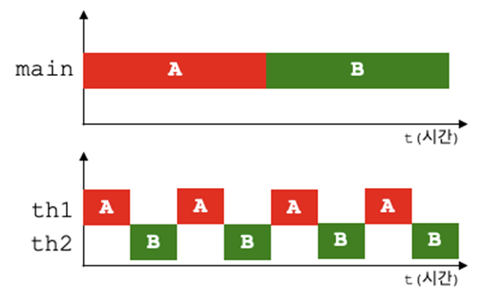 싱글쓰레드와 비교해서 번갈아가면서 실행 되었다.