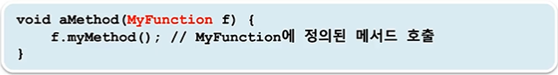 -> 매개변수에 함수형 인터페이스(MyFunction)가 오고 함수형 인터페이스안에 있는 메서드(myMethod) 호출(람다식 호출)