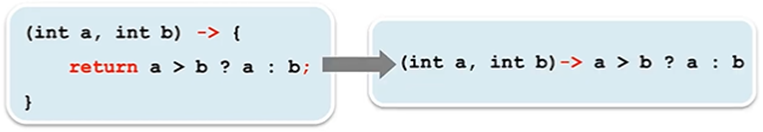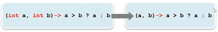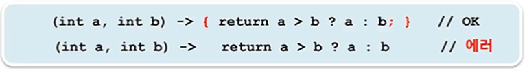 -> (int a, b) -> a > b ? a : b와 같이 두 매개변수 중 어느 하나의 타입만 생략하는 것은 허용되지 않음