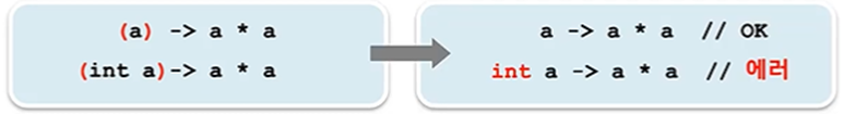 3. 매개변수의 타입이 추론 가능하면 생략가능(대부분의 경우 생략가능, )