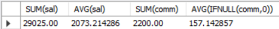Mysql> SELECT SUM(sal), AVG(sal), SUM(comm), AVG(IFNULL(comm,0)) from emp;