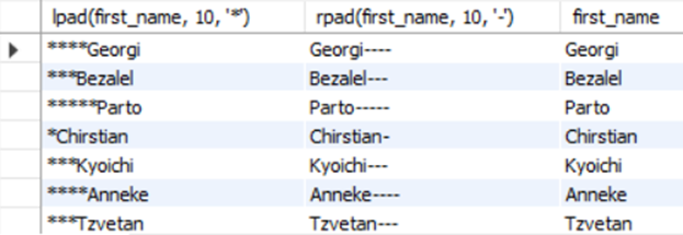 Mysql>SELECT LPADE(first_name, 10, '*'), RPAD(first_name, 10, '-'), first_name FROM employees;