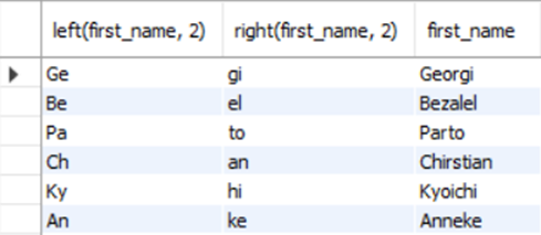 Mysql> SELECT LEFT(first_name, 2), RIGHT(first_name, 2), first_name FROM employees;