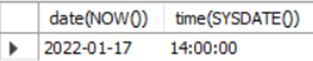 Mysql> SELECT DAYOFWEEK('2022-01-01'), MONTHNAME('2022-01-01'), DAYOFYEAR('2022-01-01');