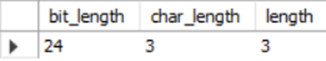 Mysql> SELECT BIT_LENGTH('abc'), CHAR_LENGTH('abc'), LENGTH('abc');