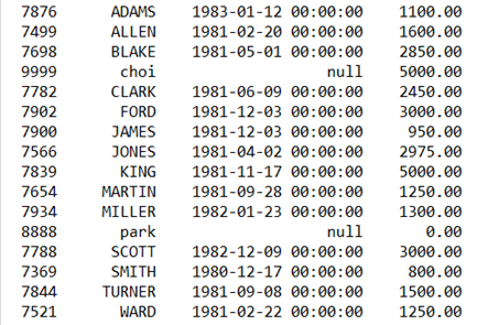 -> COMMIT 후에 변경사항이 외부에서도(자바) 저장되었다. (lee 삽입, park과 choi 삭제)