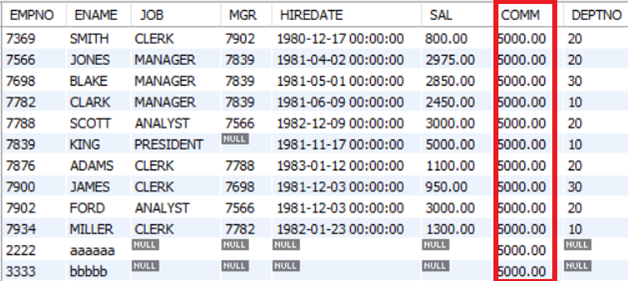 -> SAVEPOINT c가 선언되기 전으로 돌아갔다(UPDATE emp SET comm=5000; 전으로)