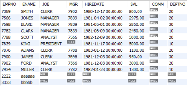 > INSERT INTO emp(empno,ename) VALUES (2222, 'aaaaaa');