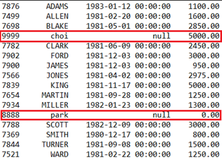 -> EMPNO 8888이 삭제되었고, ENAME ‘choi’가 삭제되었다.