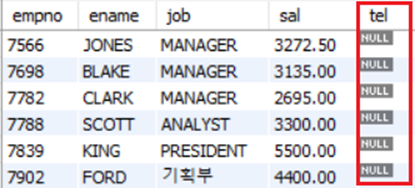 -> emp2 테이블의 tel이라는 컬럼의 데이터형식은 VARCHAR(15)로 추가한다.