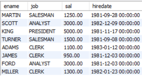 > SELECT ename, job, hiredate, sal FROM emp