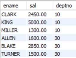 > SELECT empno, sal, deptno FROM emp WHERE (sal, deptno) IN(SELECT sal, deptno FROM emp WHERE deptno = 30;