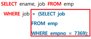 -> 이 서브쿼리를 실행 시키면, empno가 7369인 job을 먼저 검색하고 job이 ‘CLERK’인 사원의 이름과 직업을 반환한다. (서브쿼리문 먼저 실행)