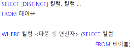 | 다중 행(Multiple-Row) 서브쿼리 | SELECT문장으로부터 하나 이상의 행을 검색하는 질의 |