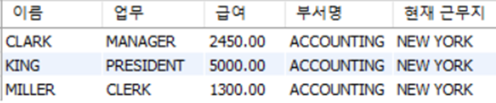 > SELECT e.ename '이름', e.job '업무', e.sal '급여', d.dname '부서명', d.loc '현재 근무지'