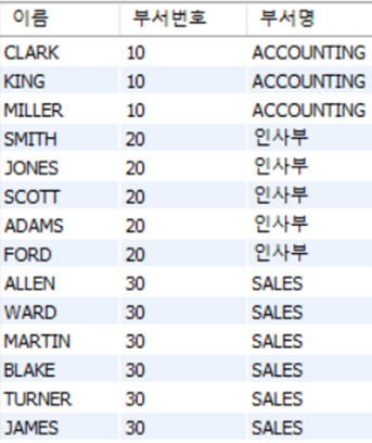 > SELECT e.ename '이름', e.deptno '부서번호', d.dname '부서명'