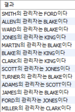 > SELECT CONCAT(e.ename, '의 관리자는 ' , m.ename, '이다') '결과'