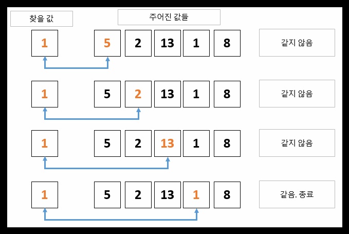 - 데이터가 모인 집합(배열, 링크드리스트 등)의 처음부터 끝까지 하나씩 순서대로 비교하며 원하는 값을 찾아내는 알고리즘