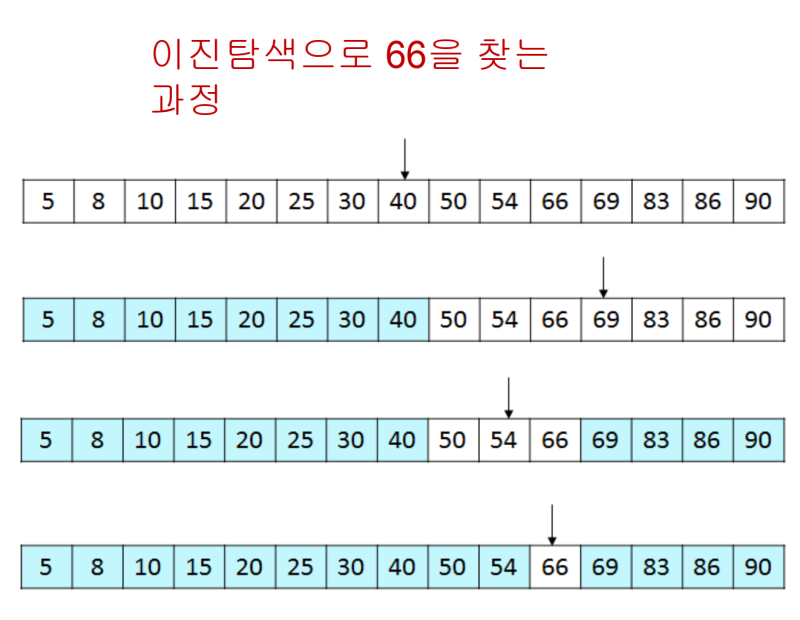 - 중앙 값을 구해 중앙값이 찾을 값보다 작으면 오른쪽으로 검색하고, 찾을 값보다 크면 왼쪽으로 검색한다.