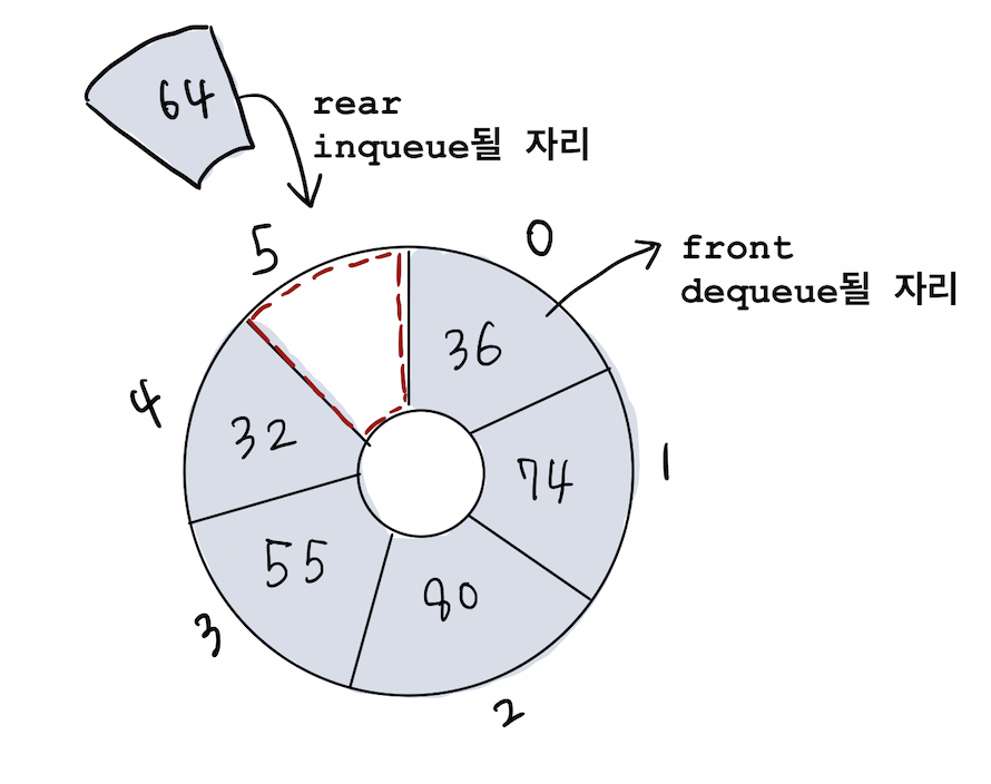 인큐할 경우: queue[5]자리에 64를 저장하고 나서 rear값을 que[0]으로 업데이트 해준다.