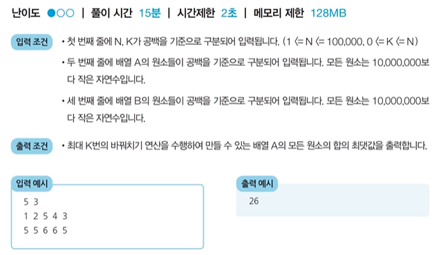 - 최대 K번의 바꿔치기 연산을 수행할 수 있는데, 바꿔치기 연산이란 배열 A에 있는 원소 하나와 배열 B에 있는 원소 하나를 골라서 두 원소를 서로 바꾸는 것을 말한다.