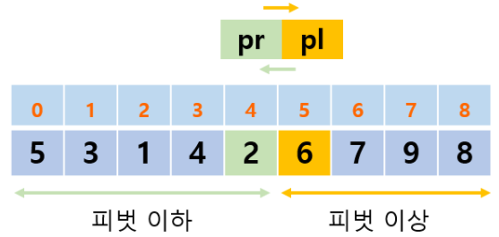 - pl의 위치값과, pr위치의 값을 교환한다. 현재 pl의 값은 pivot보다 크고, pr의 값은 pivot보다 작기 때문에 교환을 하게 되면 pivot보다 큰 값은 오른쪽으로, pivot보다 작은 값은 왼쪽으로 이동한다.