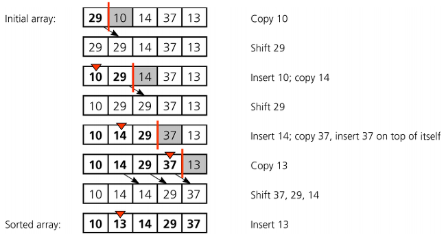 - 선택한 요소를 그보다 더 앞쪽의 알맞은 위치에 삽입하는 작업을 반복해 정렬하는 알고리즘