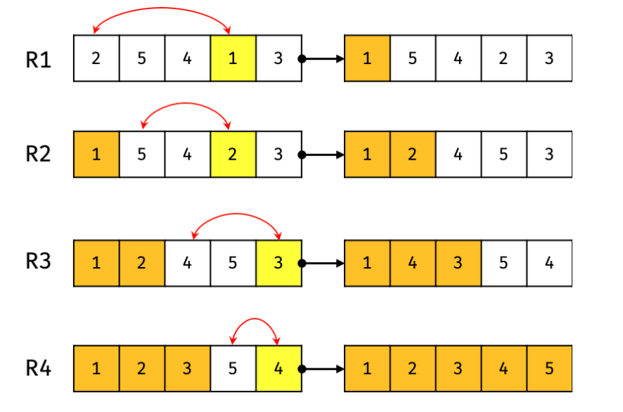 - 처리되지 않은 데이터 중에서 가장 작은 데이터를 선택해 맨 앞에 있는 데이터와 바꾸는 것을 반복