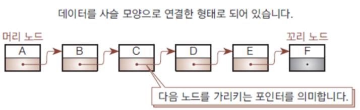 리스트의 데이터는 노드(node) 또는 요소(element)라고 한다. 각각의 노드는 데이터와 다음 노드를 가리키는 포인터를 가지고 있다.