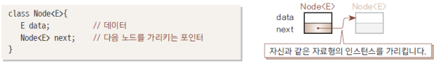 - Node<E>는 제네릭으로 구현되기 때문에 데이터 형 E는 임의의 클래스 형이 허용된다.(자유롭게 형지정 가능)