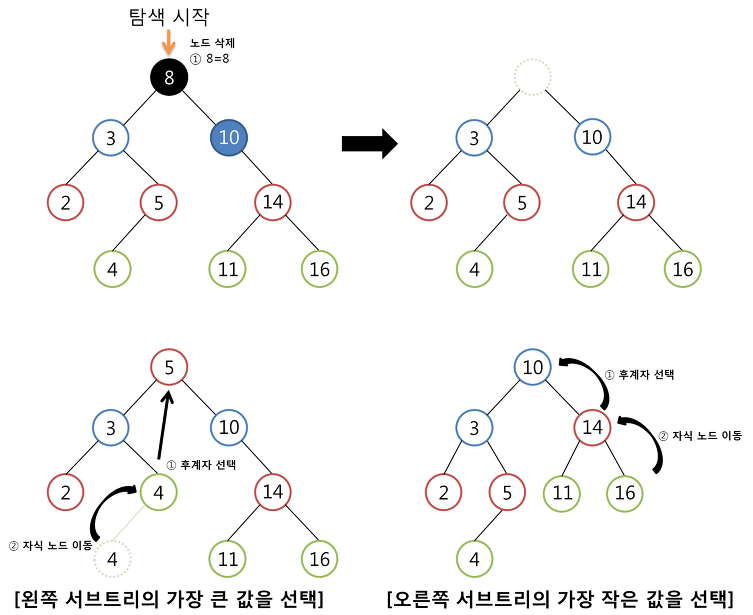 - 탐색은 항상 루트부터 선택하여 검색을 진행한다. 키 값 p와 루트 노드의 키 값을 비교한다.