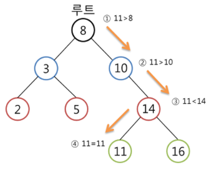 - 이진검색트리에서 원하는 값을 찾으려면, 루트부터 시작해 현재 선택한 노드의 키 값과 목표하는 값을 비교하면서 왼쪽, 오른쪽 검색을 진행한다.