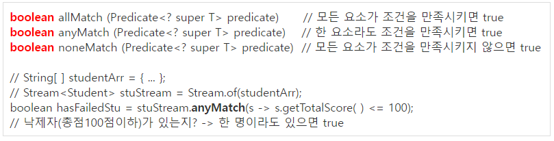 | boolean allMatch(Predicate<T> p) // 모두 만족? boolean anyMatch(Predicate<T> p) // 하나라도 만족? boolean noneMatch(Predicate<T> p) // 모두 만족하지 않는지? |