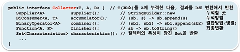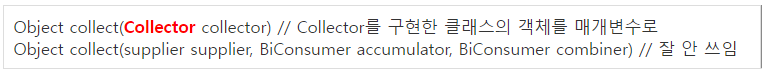 - collect()의 매개변수 타입은 Collector인데, 매개변수가 Collector를 구현한 클래스의 객체이어야 한다는 뜻이다.
