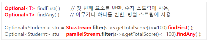 | Optional<T> findAny( ) // 아무거나 하나(병렬, filter와) Optional<T> findFirst( ) // 첫 번째 요소(직렬) |