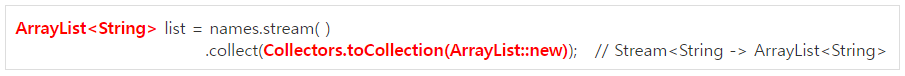 -> List나 Set이 아닌 특정 컬렉션을 지정하려면 toCollection( )에 해당컬렉션의 생성자 참조를 매개변수로 넣어주면 됨 (여기서는 반환결과가 ArrayList로!)