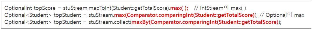 - max( )와 min( )의 경우, 초기값이 필요 없어서 Optional<T>를 반환하는 매개변수 하나짜리인 reduce( )를 사용하는 것이 낫다.